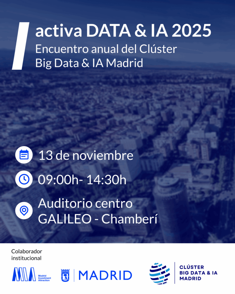 The city of Madrid reaffirms its commitment to innovation in artificial intelligence and data by hosting Activa DATA & AI Madrid 2025 on November 13 at the Galileo Center Auditorium. This annual flagship event, organized by the Big Data & AI Madrid Cluster with the support of the Madrid City Council’s Department of Economy, Innovation, and Finance, aims to consolidate the capital’s position as a leading hub transforming the city through data.