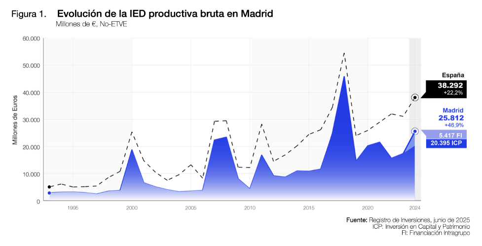 Madrid has consolidated its position as the main driver of foreign direct investment (FDI) in Spain. During 2024, the Region of Madrid attracted €24.705 billion in gross productive investment, representing 67.1% of the national total and marking the second-best record since 1993.