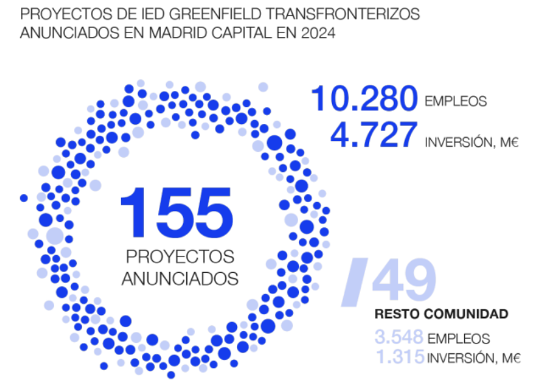 The city of Madrid remains a benchmark in attracting new greenfield projects. In 2024, 155 projects were announced with a value exceeding €4.7 billion and an estimated impact of 10,280 new jobs. These figures place the city as the second leading European destination after London, and seventh worldwide.