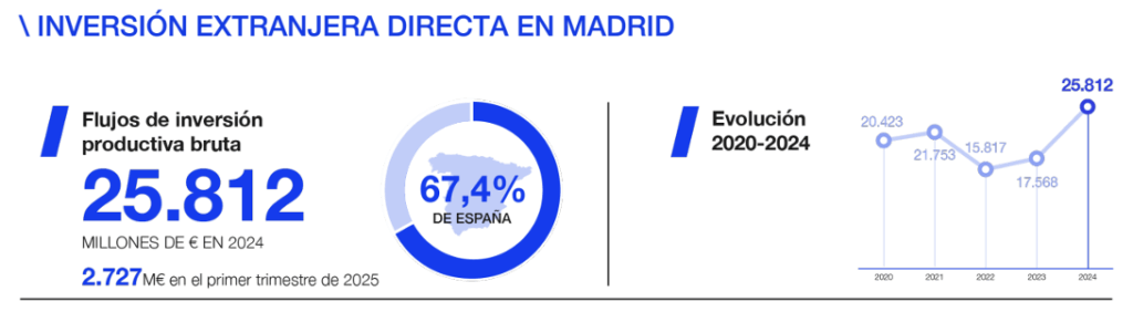 In the first quarter of 2025, Madrid had already received €2.727 billion, equivalent to 67% of the national total for that period. Despite global uncertainty and the fact that this quarter is seasonally low, the region continues to lead in investment attraction.